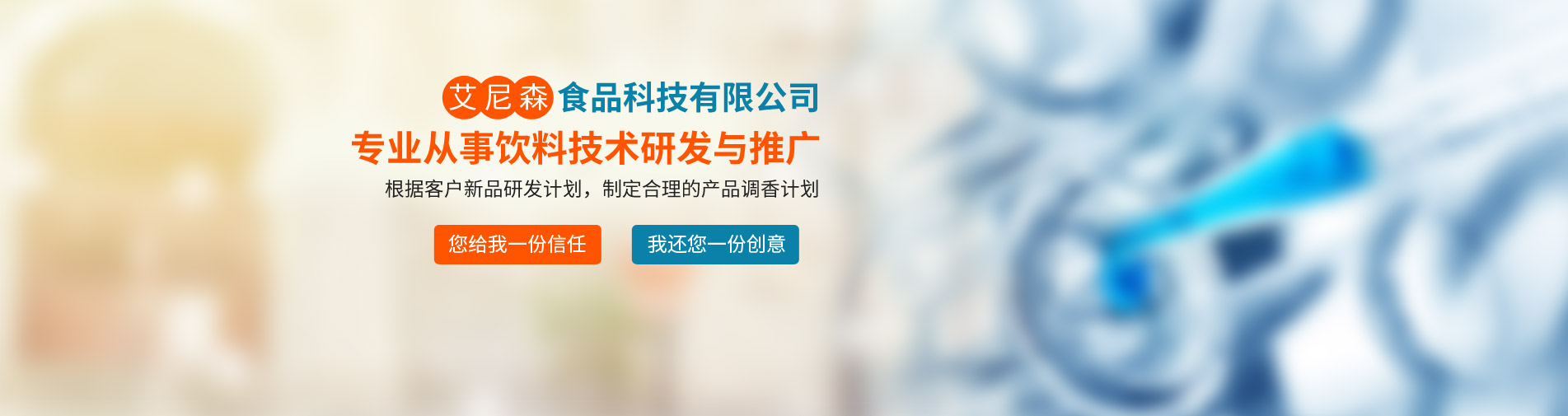 廊坊市艾尼森食品科技公司是一家專業(yè)從事飲料技術(shù)研發(fā)與推廣的公司,公司業(yè)務(wù)主要包括食品飲料技術(shù)咨詢與服務(wù)、產(chǎn)品定位與現(xiàn)有產(chǎn)品品質(zhì)改進(jìn)、新產(chǎn)品技術(shù)工藝研發(fā)等。公司坐落于京津冀核心地帶--廊坊市,位置得天獨(dú)厚,現(xiàn)與京津多家研究所形成戰(zhàn)略合作關(guān)系,為多家上市公司及知名企業(yè)提供技術(shù)支持與原材料供應(yīng)。